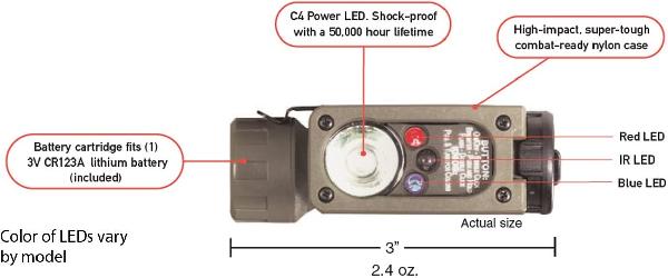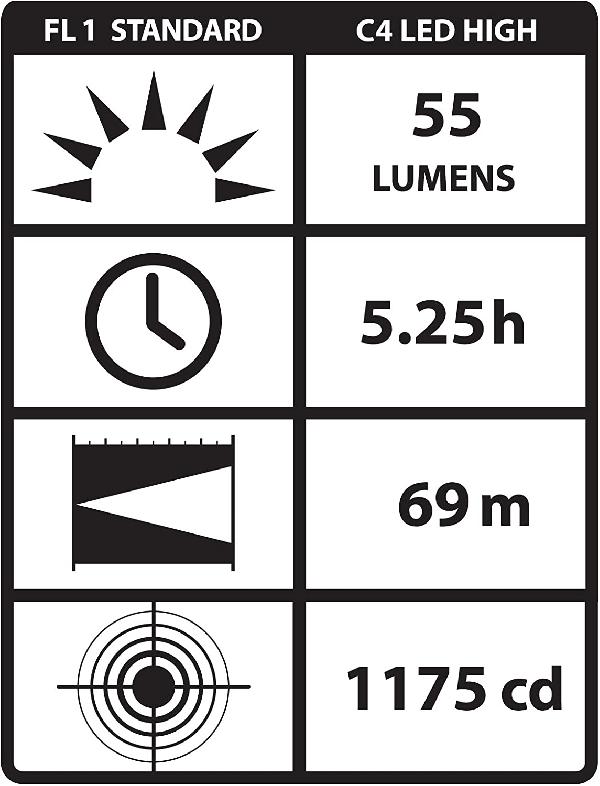 - C4 LED - головний діод білого світла, 55 люменів, 1,175 кандел макс потужність, 69 метрів дистанція;